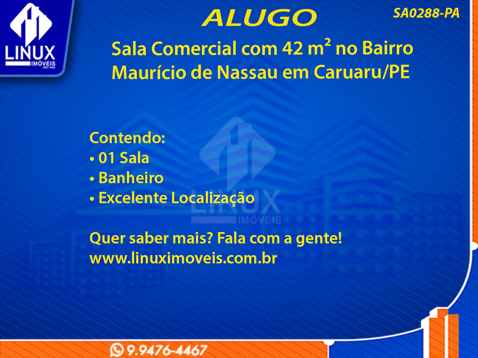 R$1.200,00 / ALUGUELSala Comercial no Bairro Maurício de Nassau em Caruaru/PE p/ Locação (SA0288-PA)