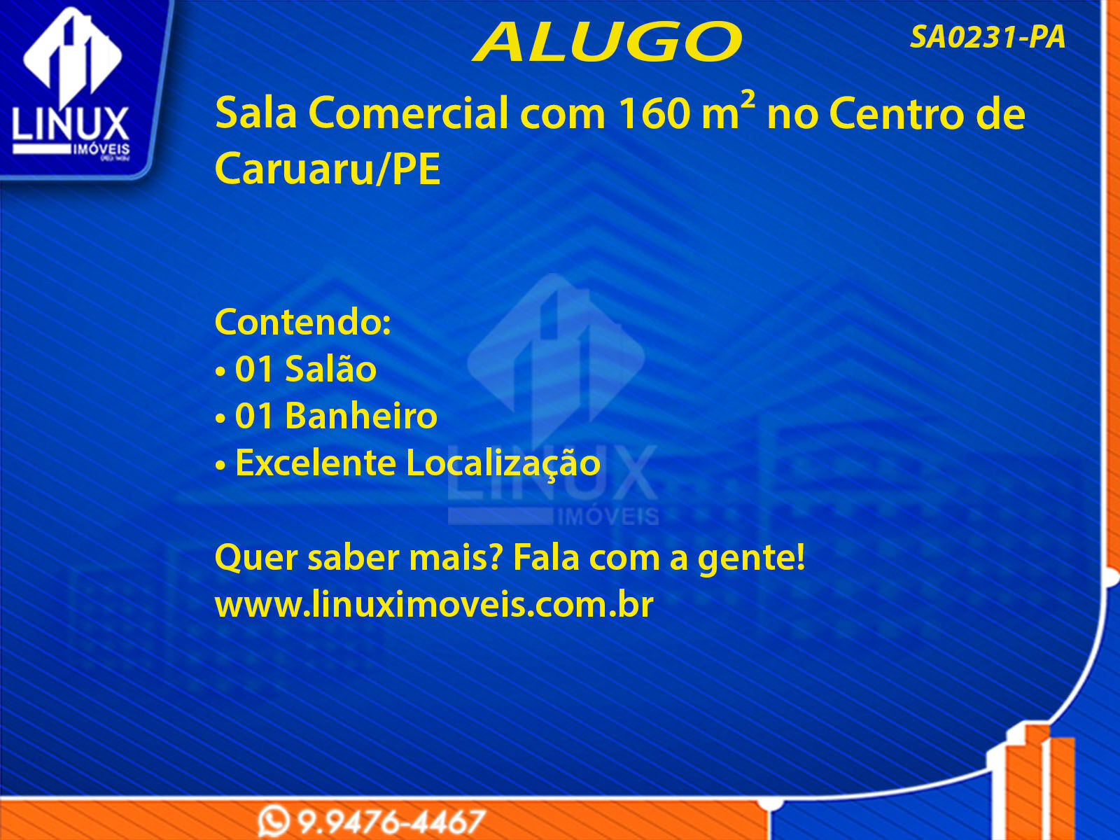 R$1.100,00 / ALUGUELSala Comercial no Centro de Caruaru/PE p/ Locação (SA0231-PA)