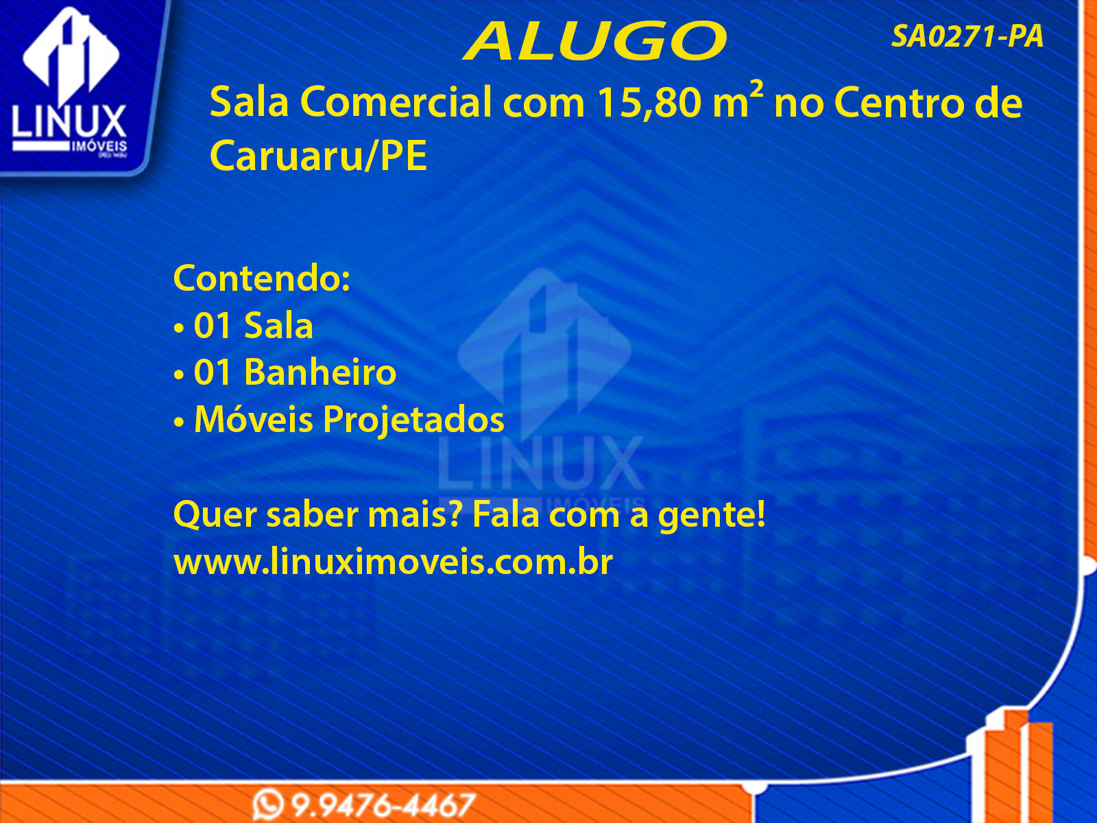 R$1.700,00 / ALUGUELSala Comercial no Centro de Caruaru/PE p/ Locação (SA0271-PA)