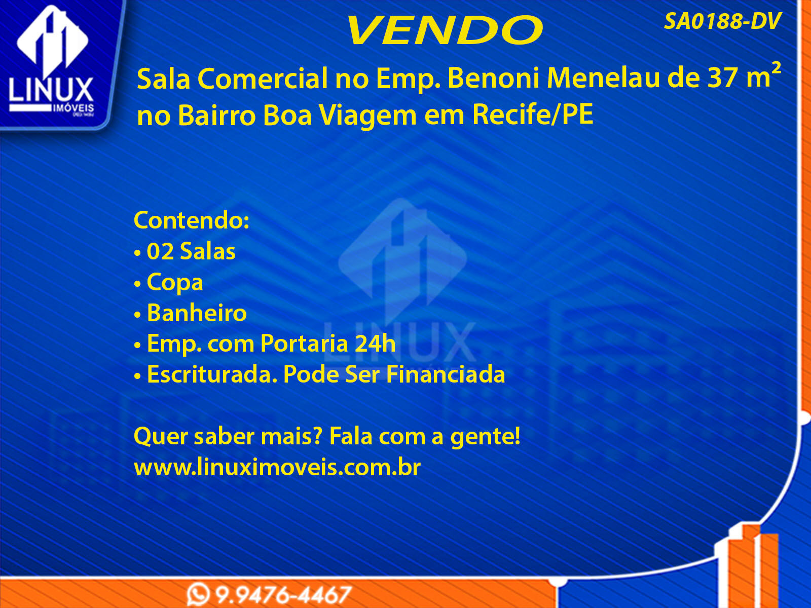 R$180.000,00 / VENDASala Comercial no Emp. Benoni Menelau em Recife/PE à Venda (SA0188-DV)