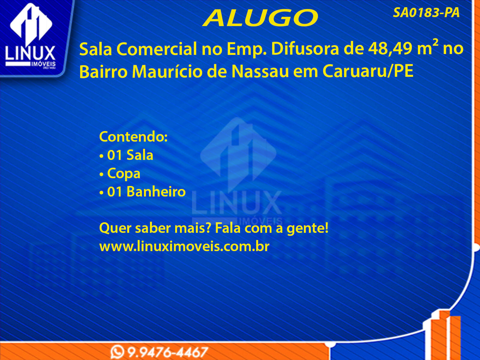 R$2.400,00 / ALUGUELSala Comercial no Emp. Difusora p/ Locação (SA0183-PA)