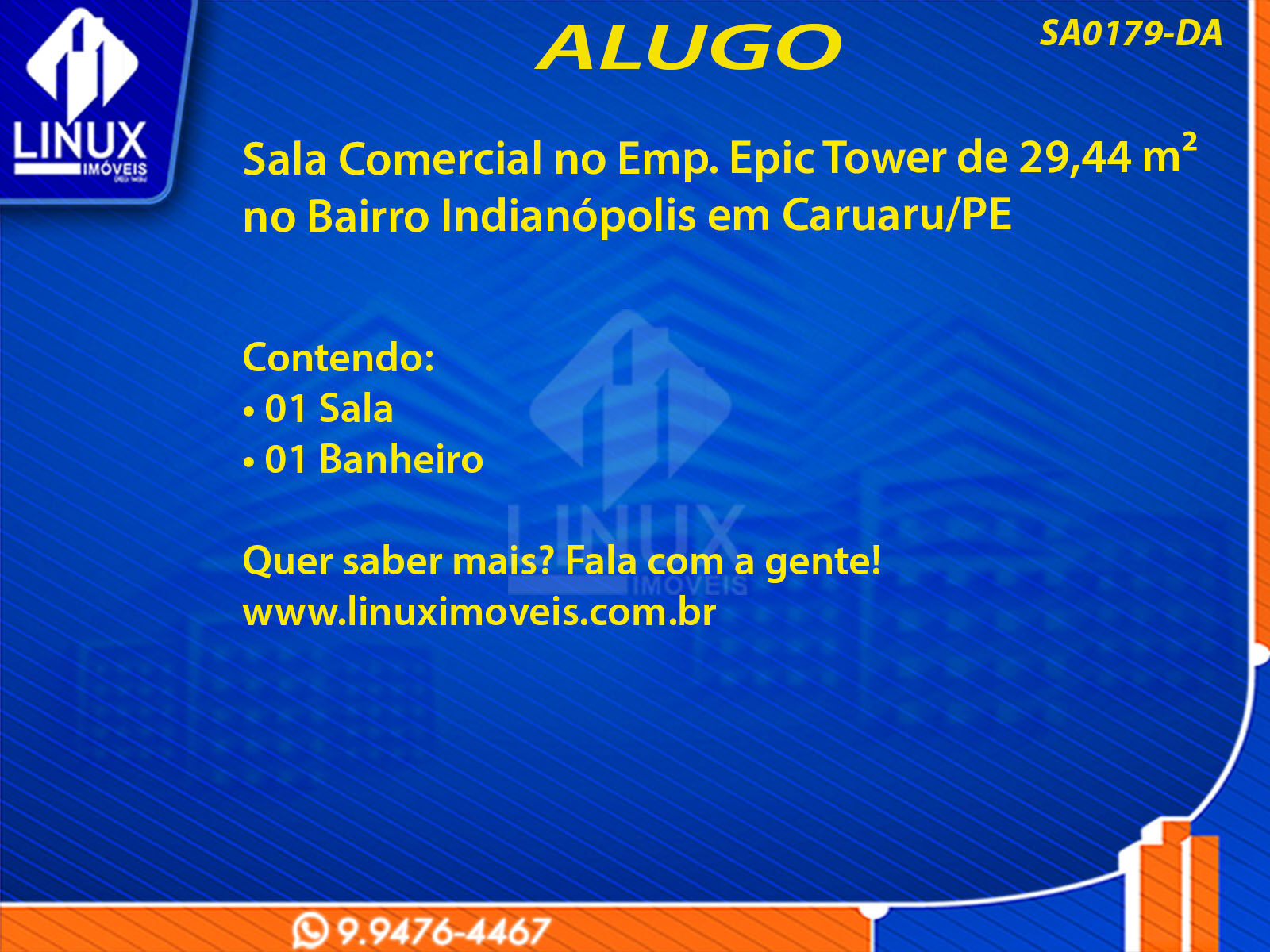 R$2.800,00 / ALUGUELSala Comercial no Emp. Epic Tower em Caruaru/PE p/ Locação (SA0179-DA)