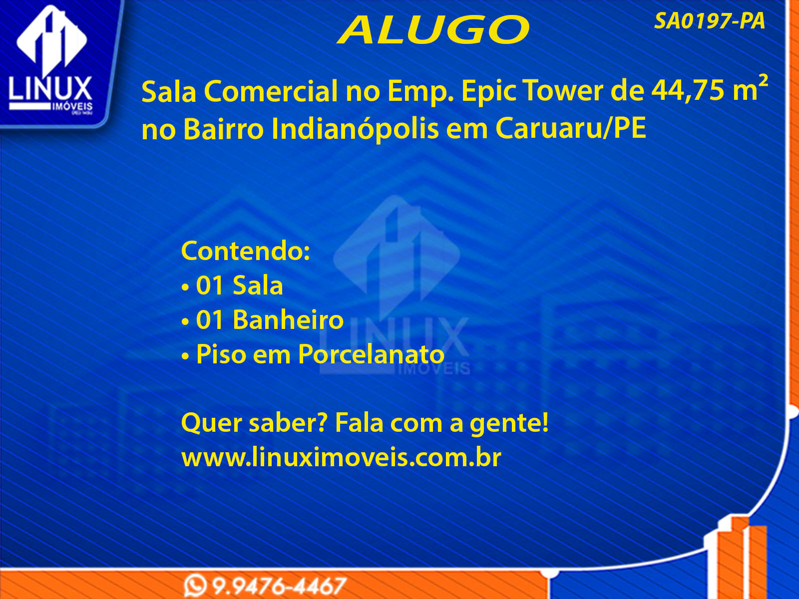 R$4.400,00 / ALUGUELSala Comercial no Emp. Epic Tower p/ Locação (SA0197-PA)