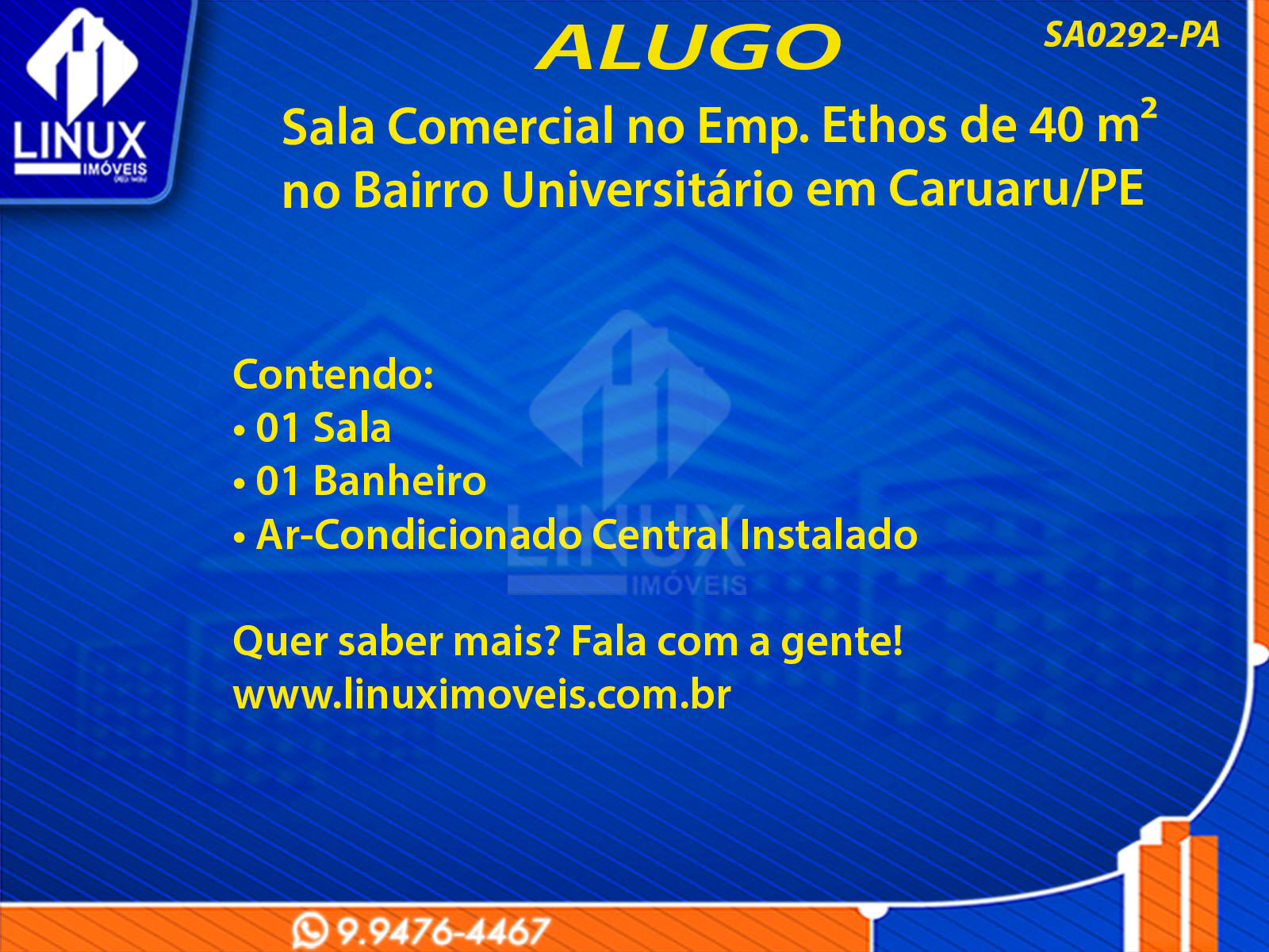 R$4.000,00 / ALUGUELSala Comercial no Emp. Ethos em Caruaru/PE p/ Locação (SA0292-PA)