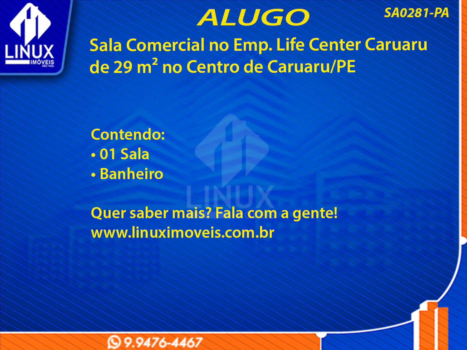 R$2.600,00 / ALUGUELSala Comercial no Emp. Life Center Caruaru em Caruaru/PE p/ Locação (SA0281-PA)