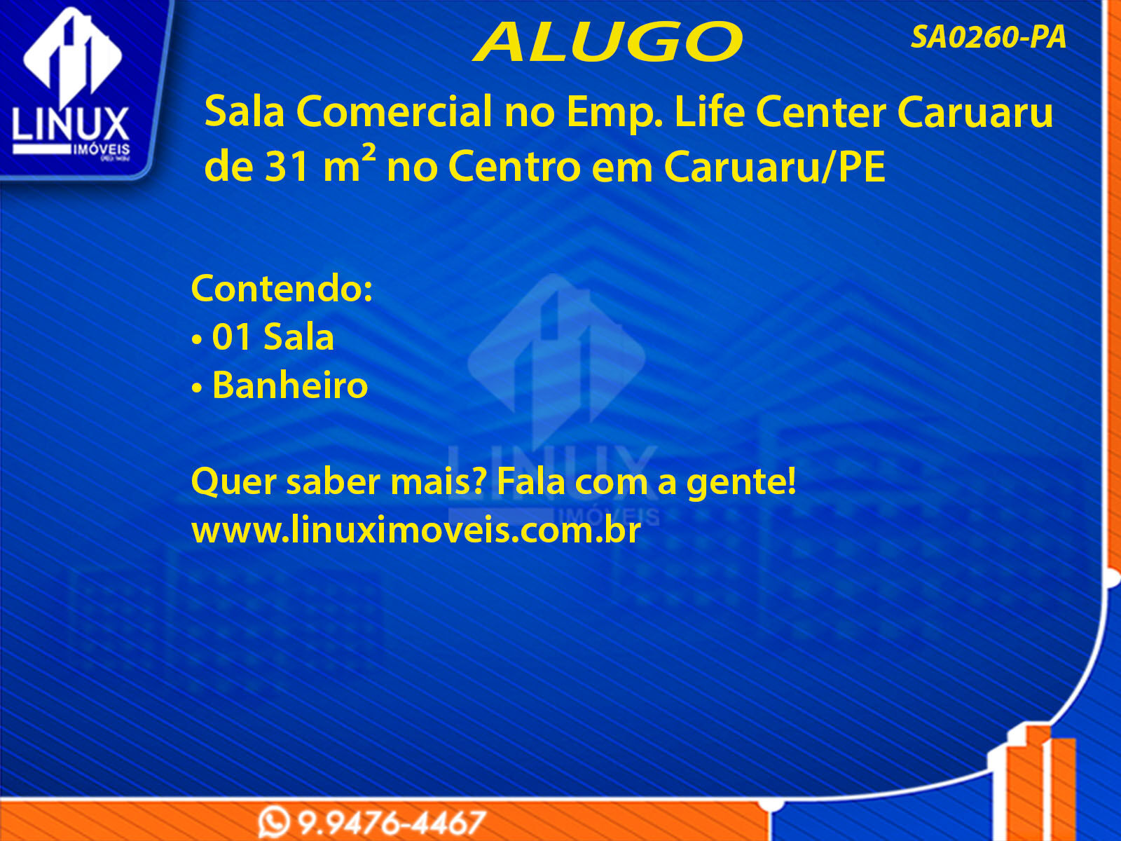 R$3.000,00 / ALUGUELSala Comercial no Emp. Life Center Caruaru em Caruaru/PE p/ Locação (SA0260-PA)