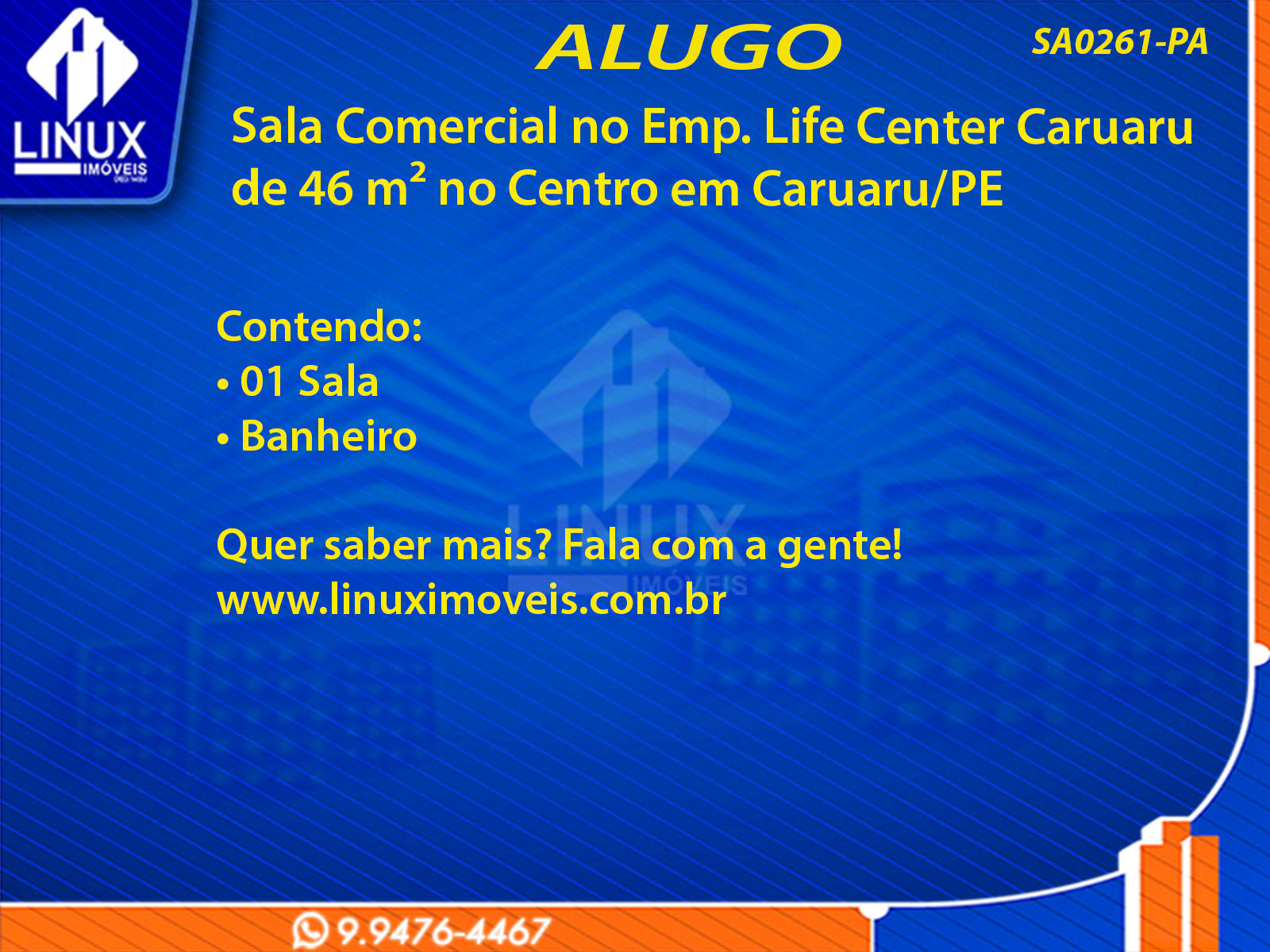 R$4.500,00 / ALUGUELSala Comercial no Emp. Life Center Caruaru p/ Locação (SA0261-PA)