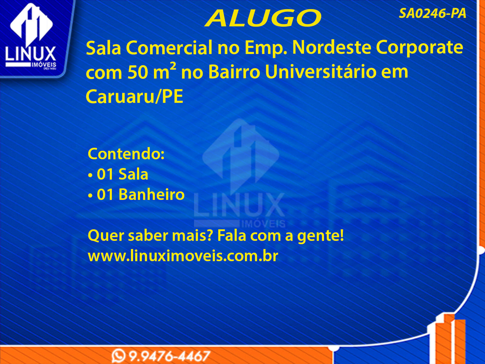 R$2.350,00 / ALUGUELSala Comercial no Emp. Nordeste Corporate em Caruaru/PE p/ Locação (SA0246-PA)