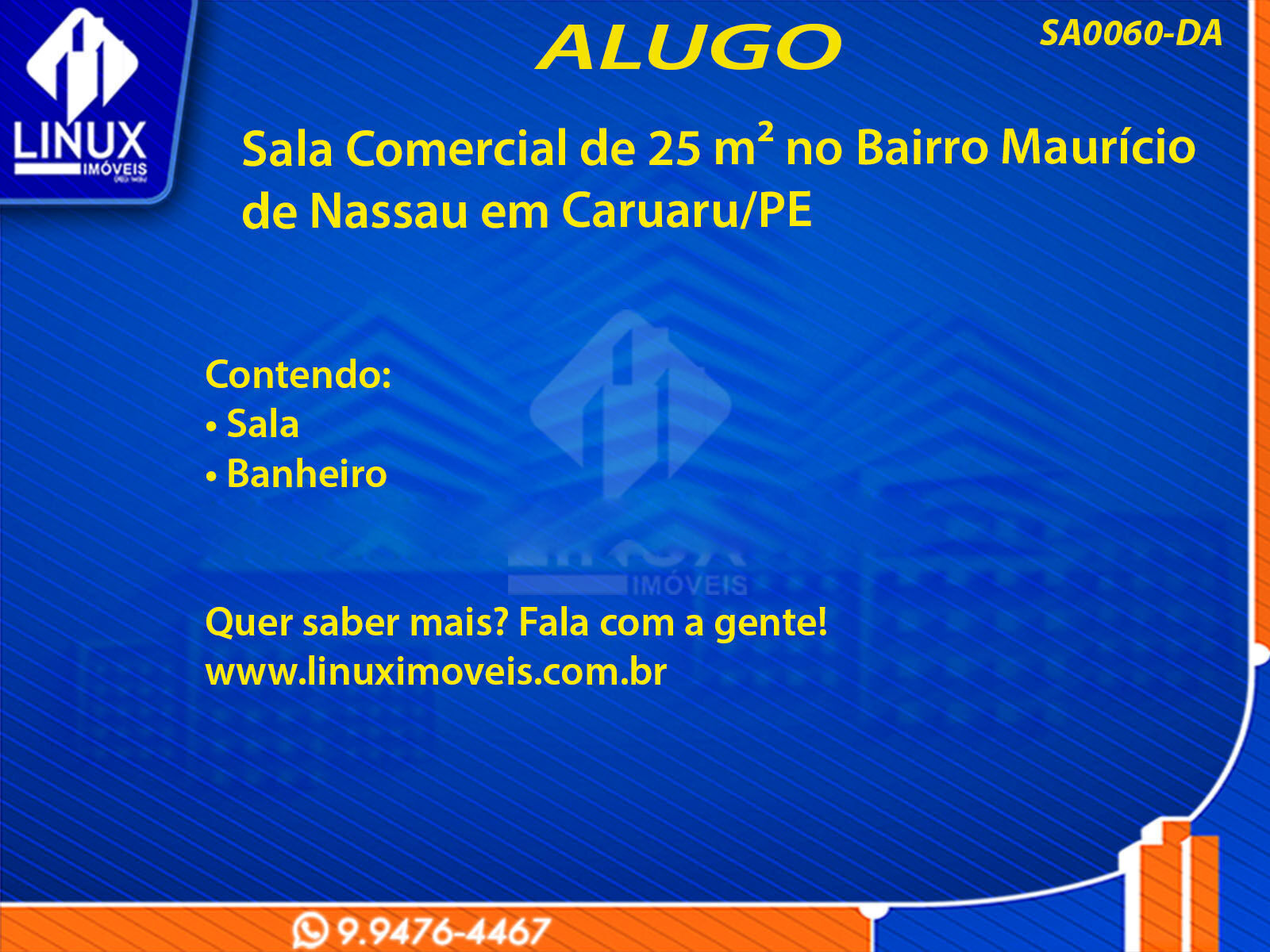 R$900,00 / ALUGUELSala Comercial no Maurício de Nassau p/ Locação (SA0060-DA)