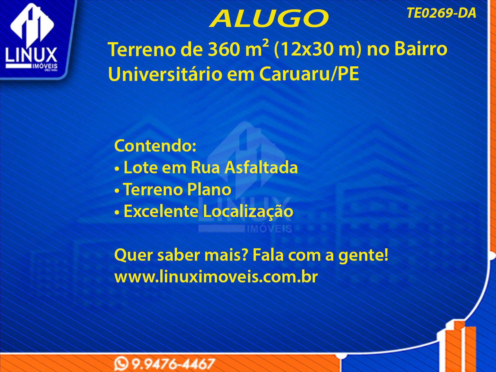 Terreno de 360 m² (12x30 m) no Bairro Universitário em Caruaru/PE