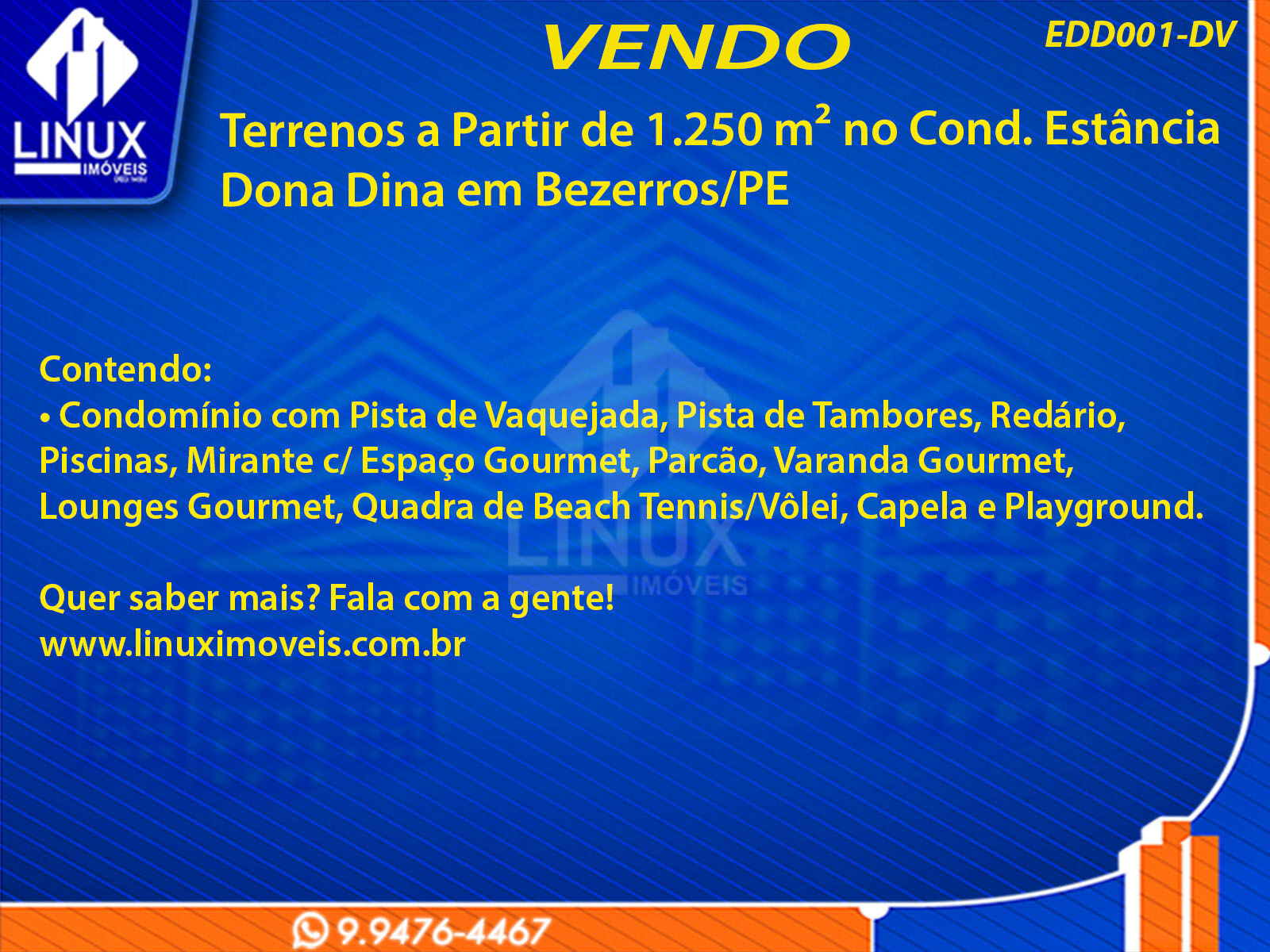 • Condomínio com Pista de Vaquejada, Pista de Tambores, Redário, Piscinas, Mirante c/ Espaço Gourmet, Parcão, Varanda Gourmet, Lounges Gourmet, Quadra de Beach Tennis/Vôlei, Capela e Playground