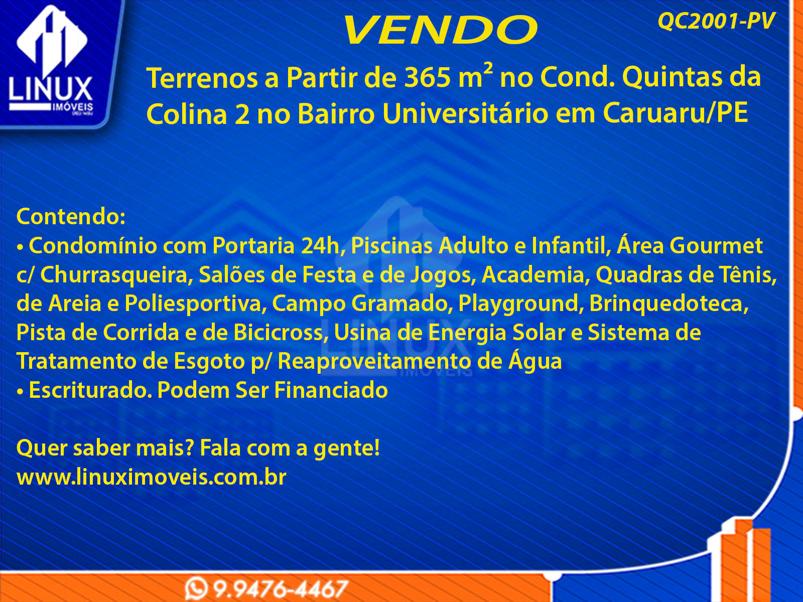 Terrenos no Cond. Quintas da Colina 2 a Partir de 365 m² no Bairro Universitário em Caruaru/PE